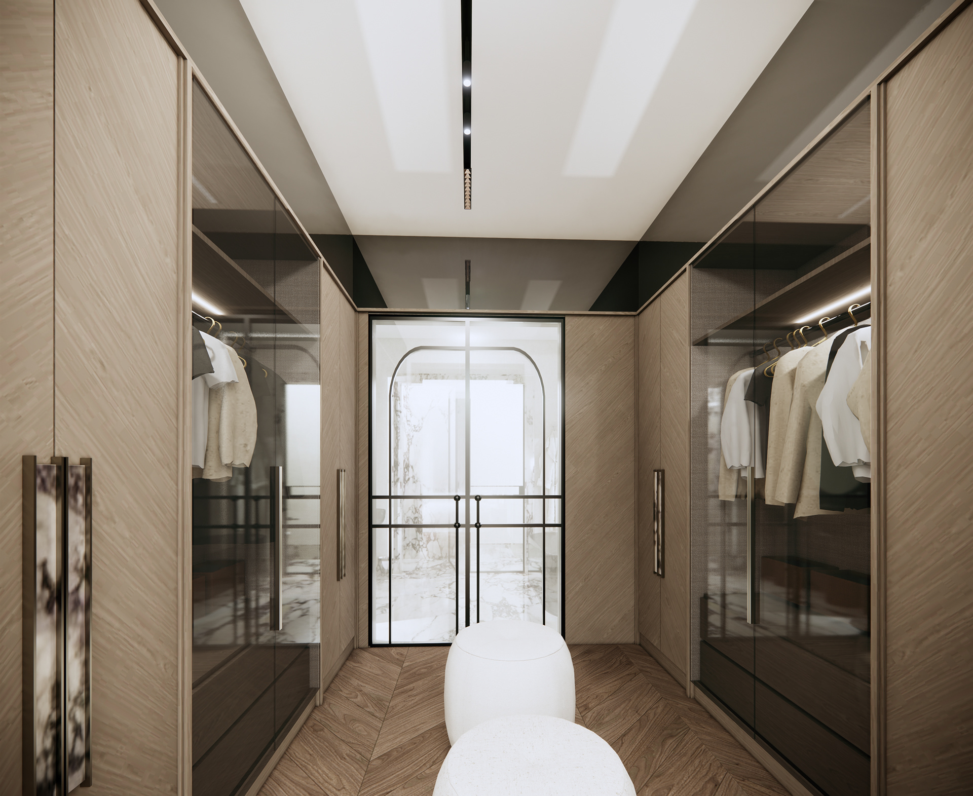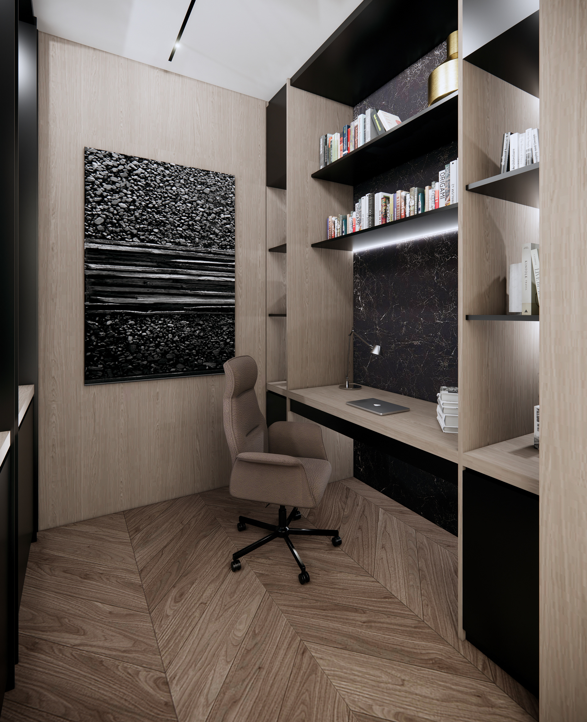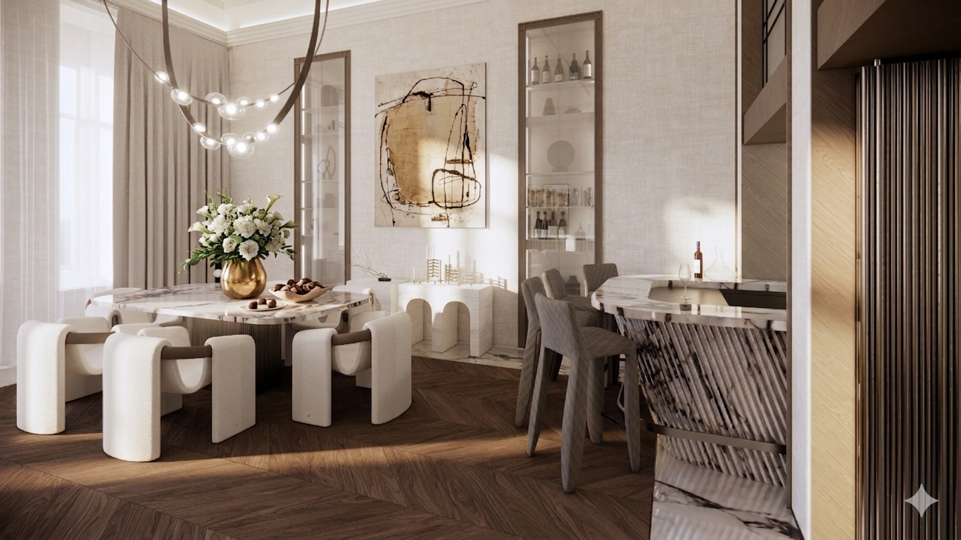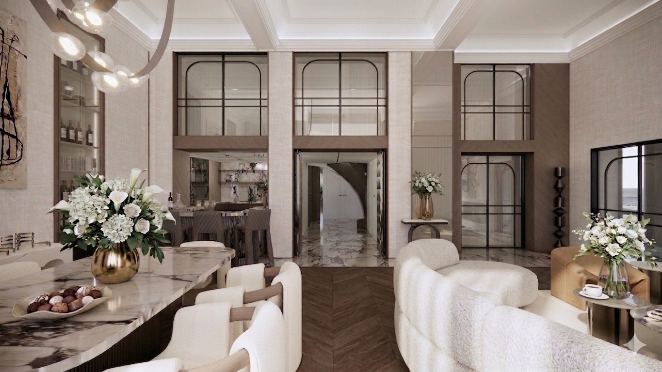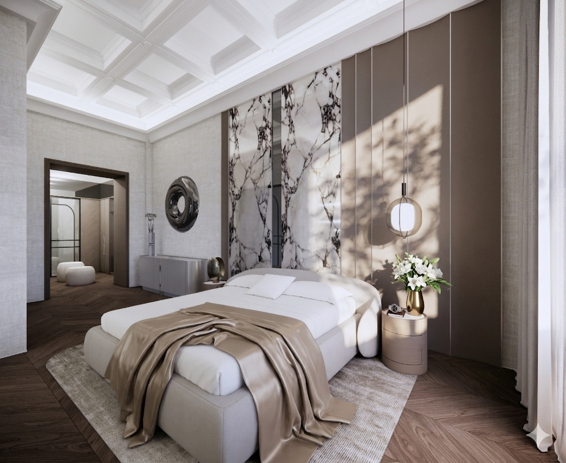 The material palette is carefully selected to create a sense of elegance and comfort. Calacatta Viola marble introduces an artistic layer, with its distinctive veining adding depth and expression to the surfaces. Oak chevron flooring brings warmth and continuity to the interior, complemented by natural linen wallpaper and leather wall finishes that enhance the overall softness of the space.