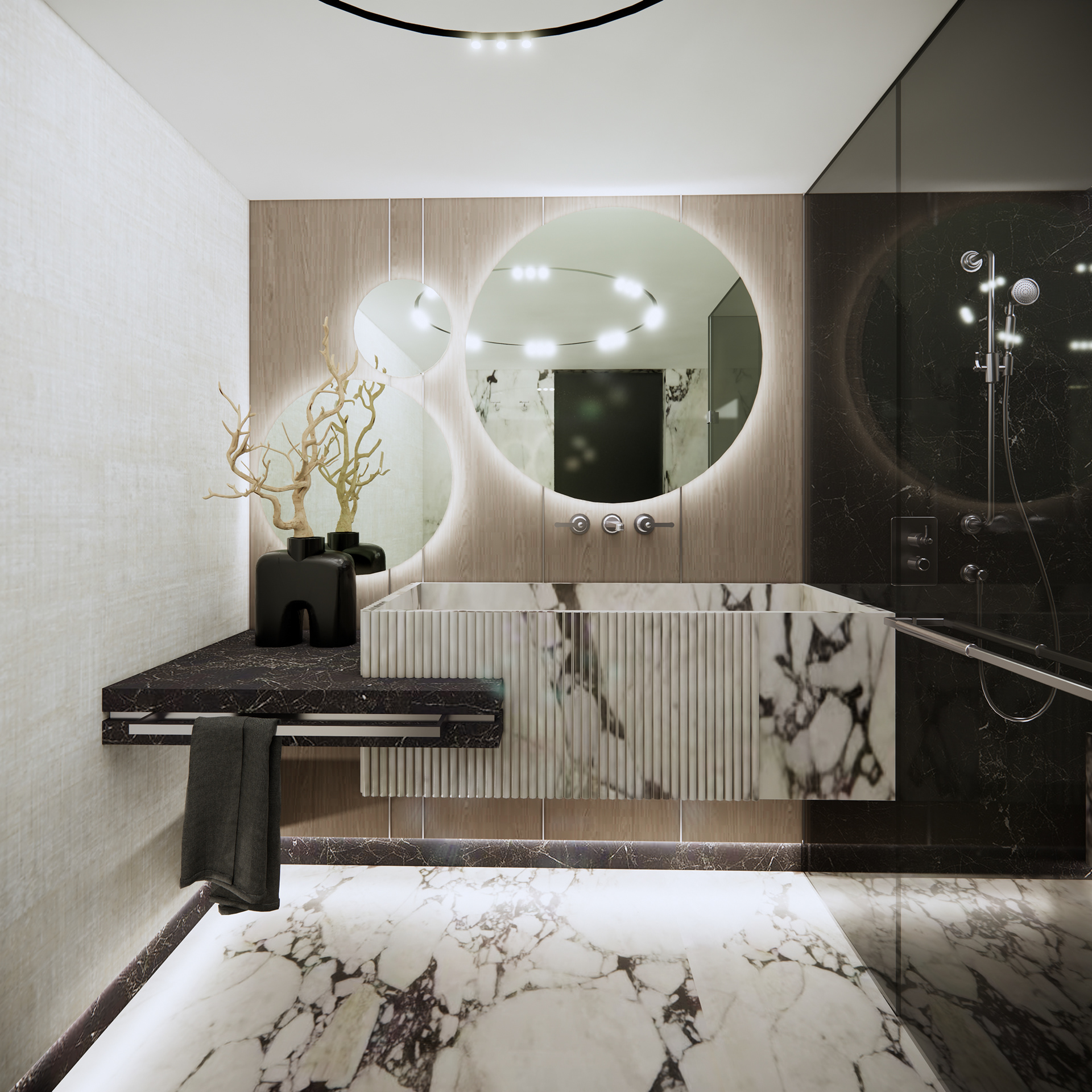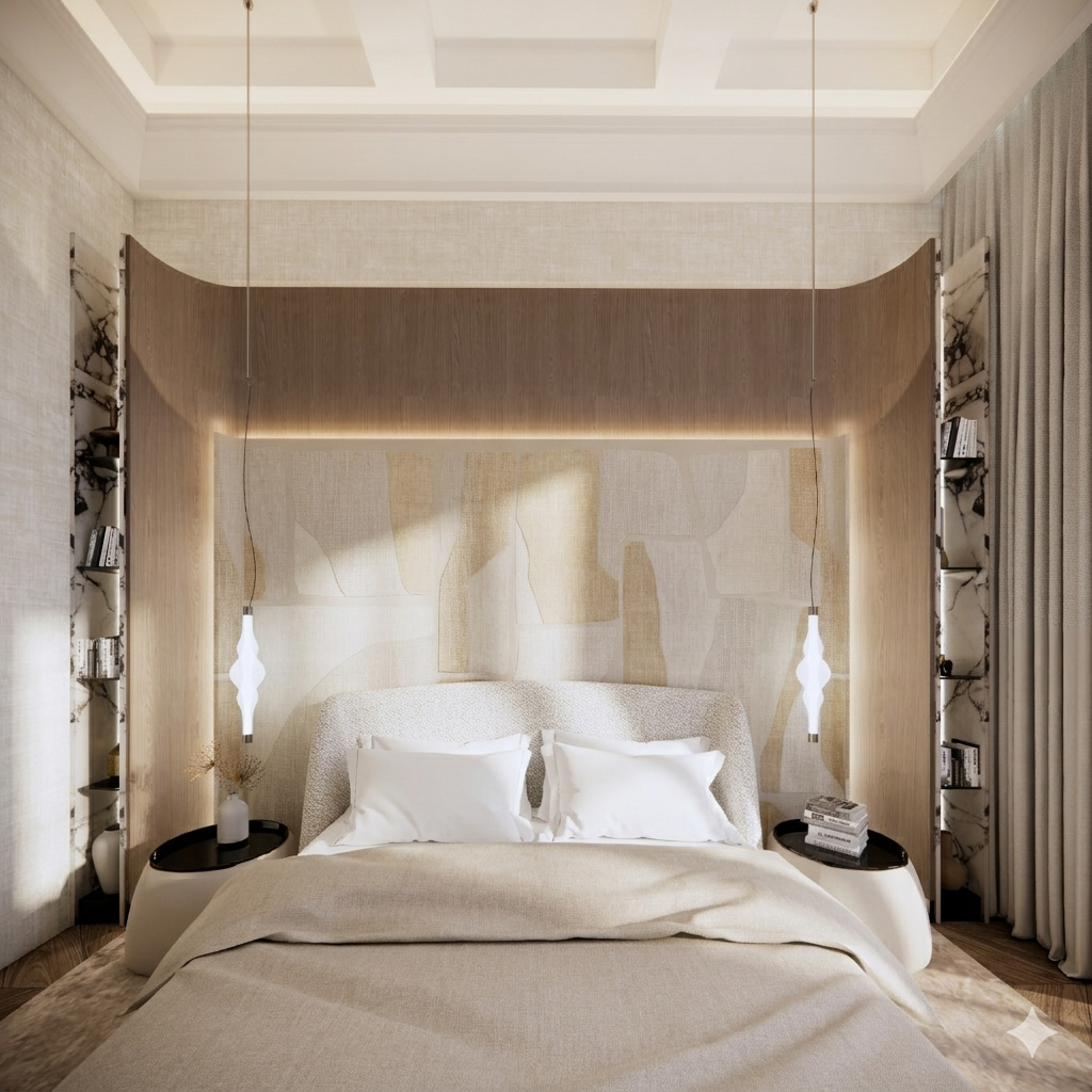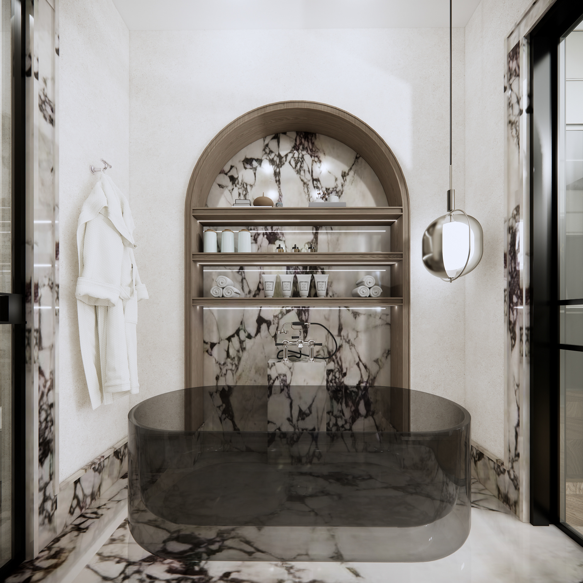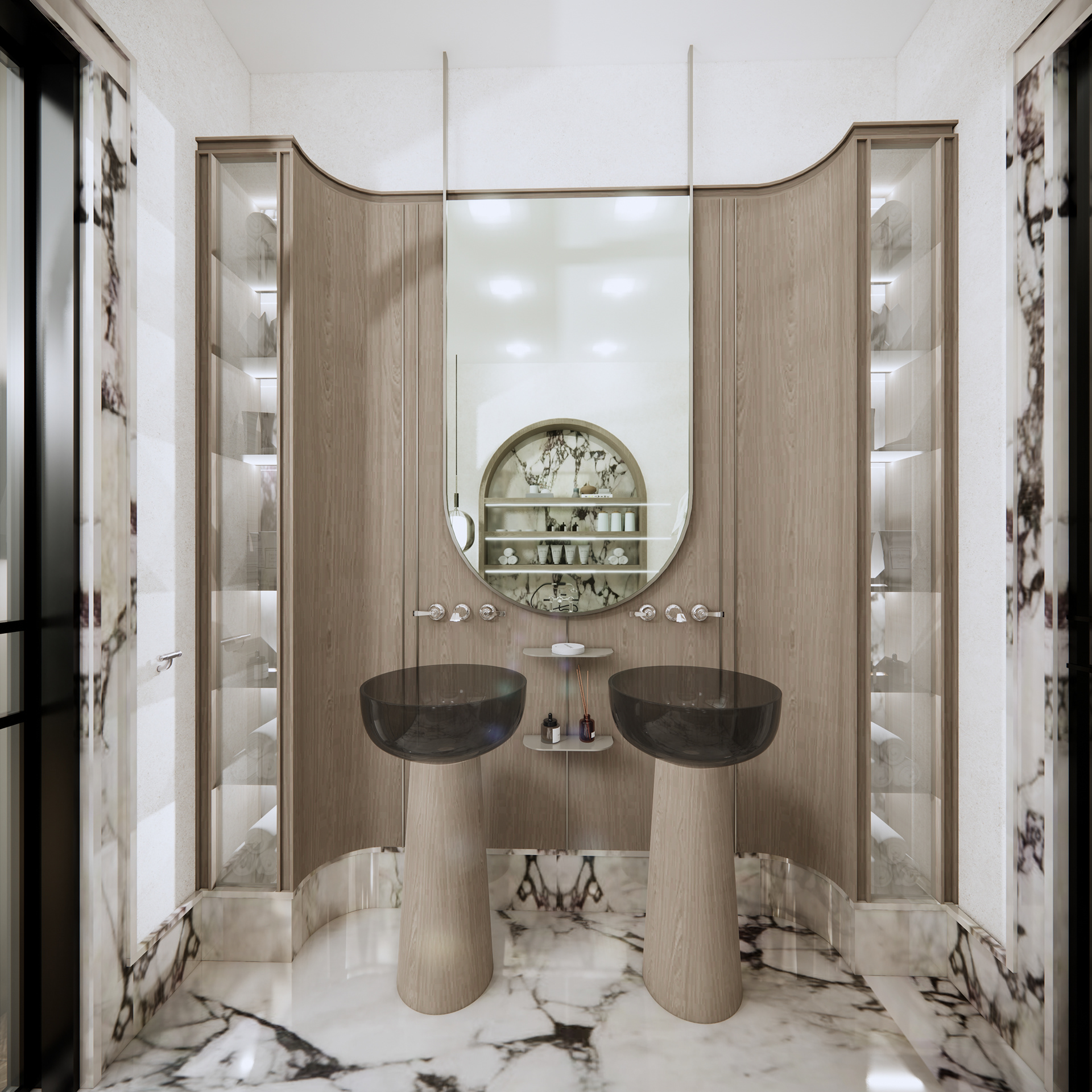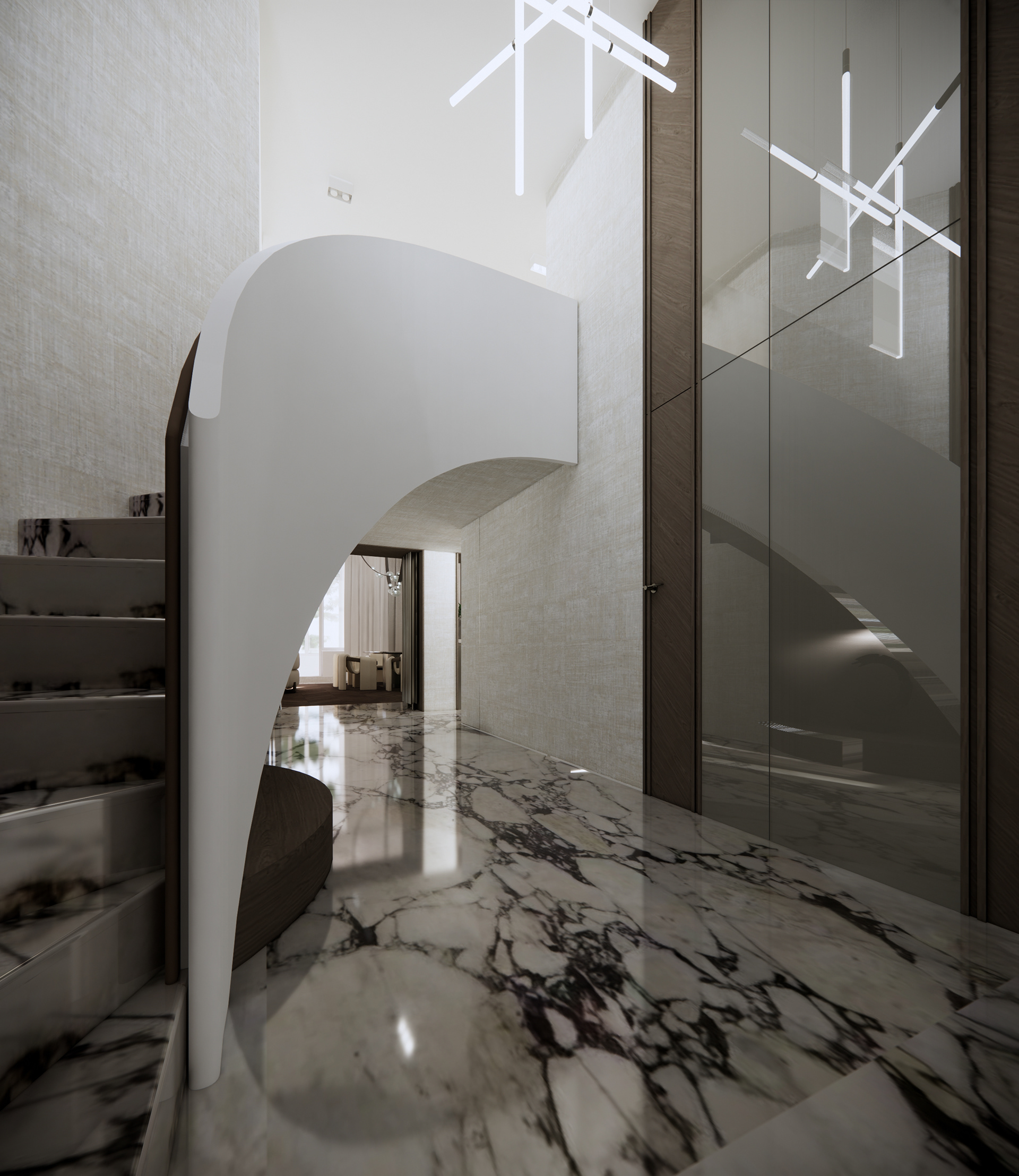 The material palette is carefully selected to create a sense of elegance and comfort. Calacatta Viola marble introduces an artistic layer, with its distinctive veining adding depth and expression to the surfaces. Oak chevron flooring brings warmth and continuity to the interior, complemented by natural linen wallpaper and leather wall finishes that enhance the overall softness of the space.