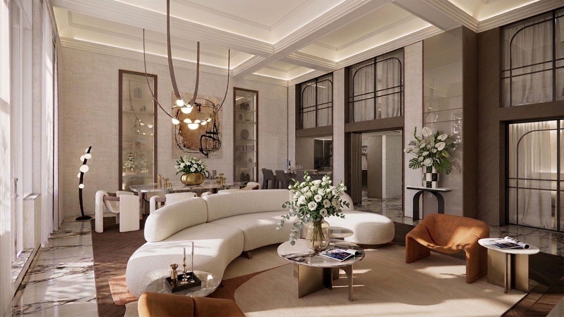 Разпределението съчетава яснота и функционалност и запазва усещането за преливане на функциите в основните дневни зони. Апартаментът разполага с четири спални, включително родителска спалня със собствена баня и гардеробно пространство, както и три допълнителни бани, кабинет и зони за игра и съхранение. Мецанин нивото въвежда динамичен обем в пространството, предлагайки самостоятелна спалня със собствена баня към нея, както и отворена вторична дневна зона - приветливо място за игра, четене или релакс на децата.